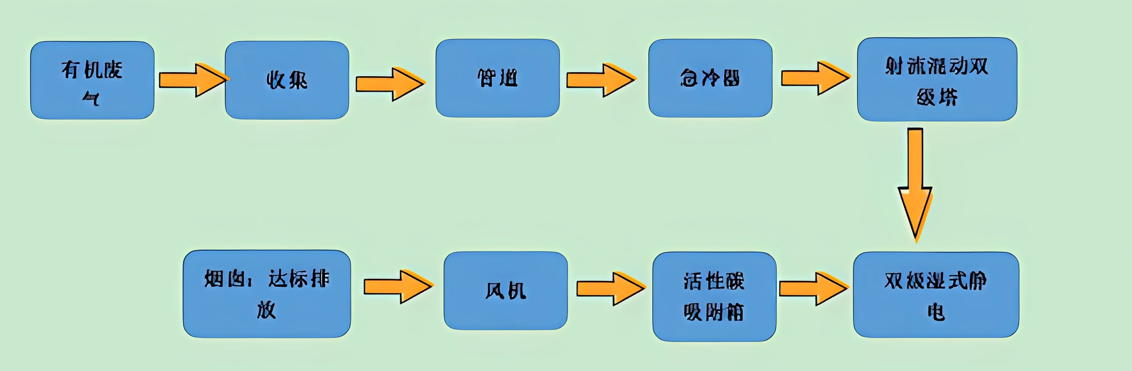 由急冷器降溫到60℃以下,降溫后的酸性氣體和voc送到我們的射流混動(dòng)雙級(jí)塔,進(jìn)行一個(gè)酸堿中和以及去除煙氣中的部分粉塵顆粒物,經(jīng)過射流混動(dòng)雙級(jí)塔處理后的廢氣,帶著剩余煙氣和vocs進(jìn)入我們的濕電繼續(xù)處理